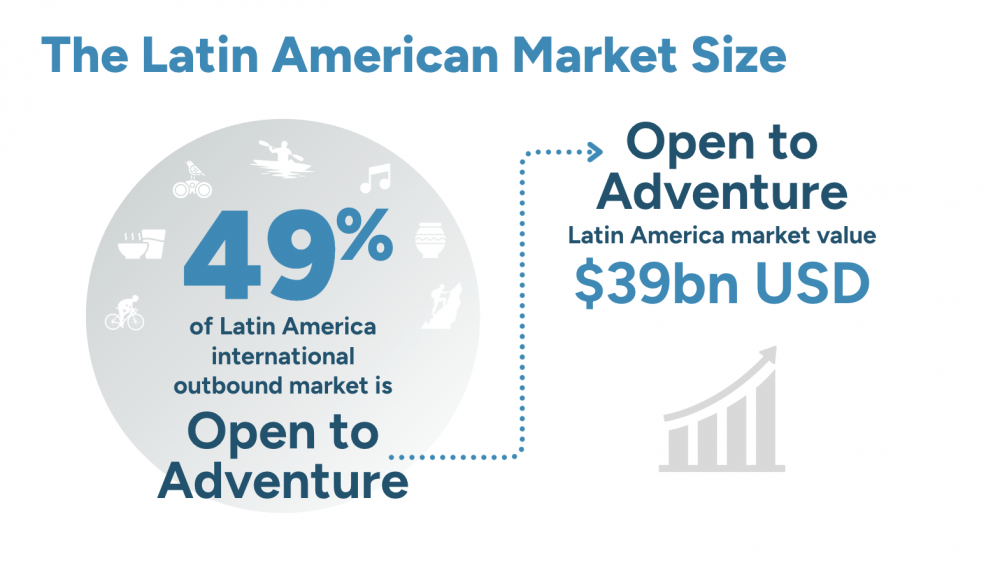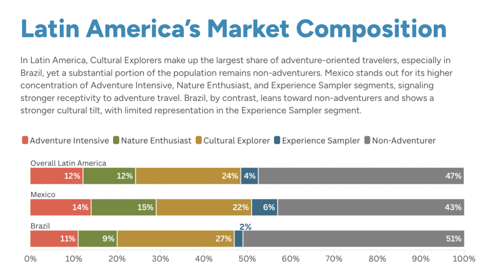 This report examines the $39 billion Latin American outbound adventure market and the travelers shaping its growth. Nearly half (49%) of Latin America’s international outbound market is “Open to Adventure,” meaning travelers are willing to incorporate active, cultural, or nature-based experiences into their trips, even when adventure is not the primary motivation.