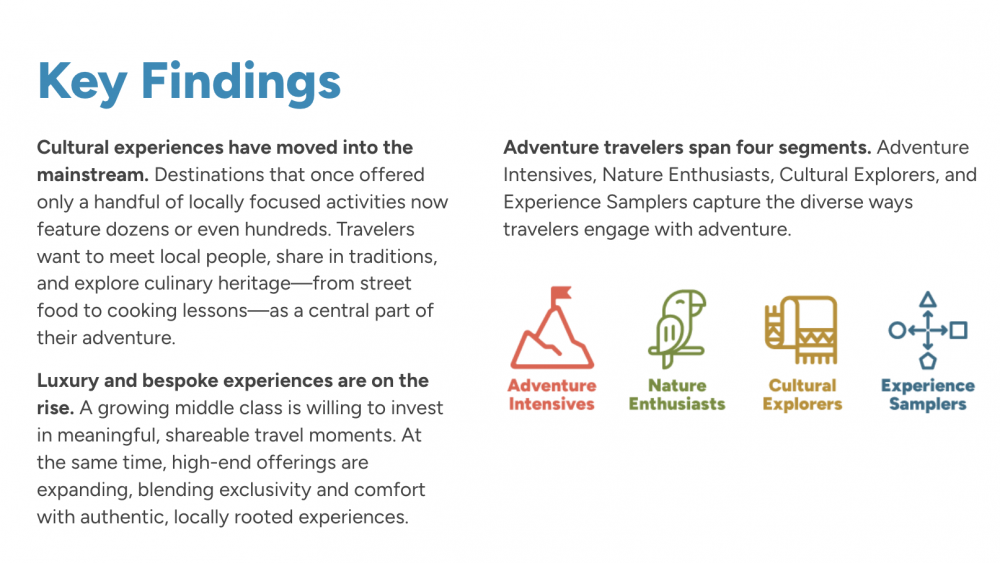 Within this growing market, the "Open to Adventure" traveler can be understood across four key segments: Adventure Intensives, Cultural Explorers, Nature Enthusiasts, and Experience Samplers.